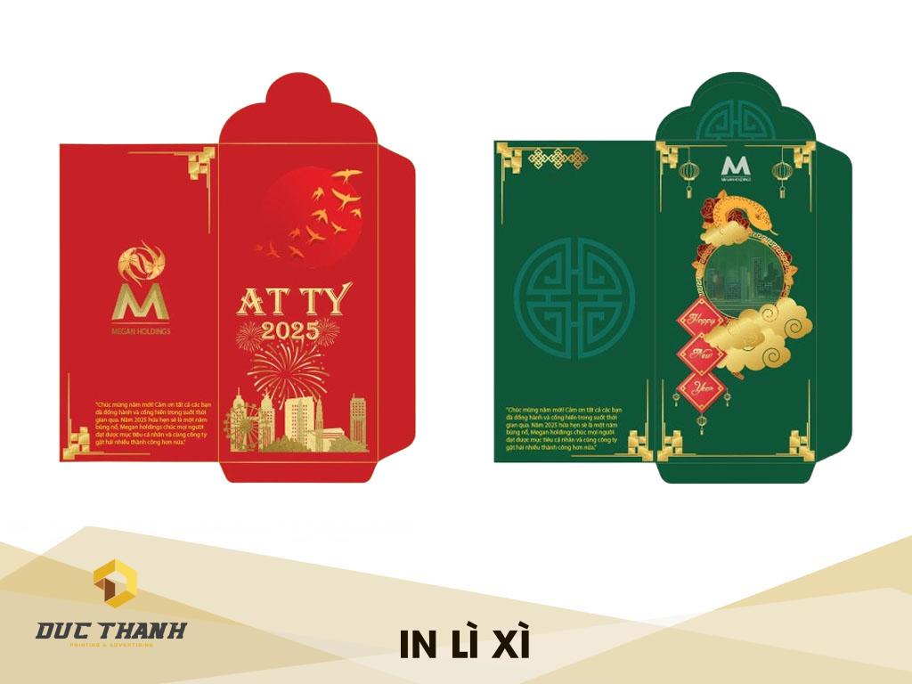 - Từ thông tin khách hàng cung cấp, đội ngũ thiết kế riêng của In Đức Thành sẽ sáng tạo mẫu lì xì theo phong cách thương hiệu – hài hòa giữa màu sắc, logo và thông điệp Tết.